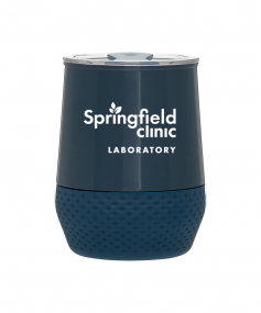 12 oz double wall 18/8 stainless steel thermal tumbler with copper vacuum insulation, push-on lid, matching swivel closure, and removable silicone base.