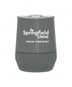 12 oz double wall 18/8 stainless steel thermal tumbler with copper vacuum insulation, push-on lid, matching swivel closure, and removable silicone base.