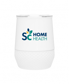 12 oz double wall 18/8 stainless steel thermal tumbler with copper vacuum insulation, push-on lid, matching swivel closure, and removable silicone base.
