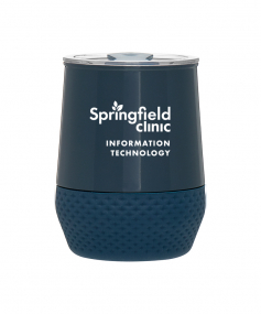 12 oz double wall 18/8 stainless steel thermal tumbler with copper vacuum insulation, push-on lid, matching swivel closure, and removable silicone base.