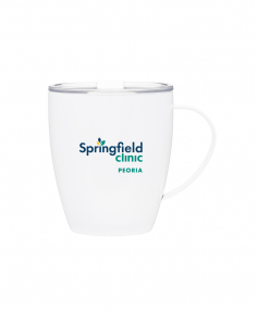 12 oz double wall 18/8 stainless steel thermal mug with copper vacuum insulation, clear acrylic push-on lid, and matching swivel; Hand wash recommended; Do not microwave; 4-7/16" h x 4"w (4-7/8 with handle) ; 355mL.