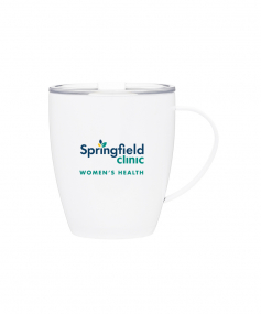 12 oz double wall 18/8 stainless steel thermal mug with copper vacuum insulation, clear acrylic push-on lid, and matching swivel; Hand wash recommended; Do not microwave; 4-7/16" h x 4"w (4-7/8 with handle) ; 355mL.