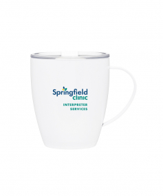 12 oz double wall 18/8 stainless steel thermal mug with copper vacuum insulation, clear acrylic push-on lid, and matching swivel; Hand wash recommended; Do not microwave; 4-7/16" h x 4"w (4-7/8 with handle) ; 355mL.