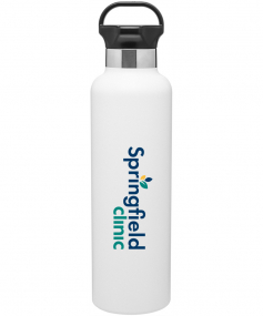 24 oz powder coated double wall 18/8 stainless steel thermal bottle with copper vacuum insulation, threaded gear-shaped insulated lid and carrying handle Complies with FDA, Prop 65. 11.25" H x 3" W