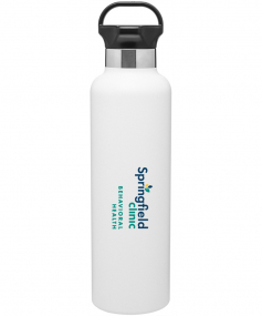 24 oz powder coated double wall 18/8 stainless steel thermal bottle with copper vacuum insulation, threaded gear-shaped insulated lid and carrying handle Complies with FDA, Prop 65. 11.25" H x 3" W