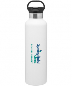 24 oz powder coated double wall 18/8 stainless steel thermal bottle with copper vacuum insulation, threaded gear-shaped insulated lid and carrying handle Complies with FDA, Prop 65. 11.25" H x 3" W