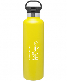 24 oz powder coated double wall 18/8 stainless steel thermal bottle with copper vacuum insulation, threaded gear-shaped insulated lid and carrying handle Complies with FDA, Prop 65. 11.25" H x 3" W