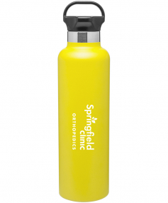24 oz powder coated double wall 18/8 stainless steel thermal bottle with copper vacuum insulation, threaded gear-shaped insulated lid and carrying handle Complies with FDA, Prop 65. 11.25" H x 3" W