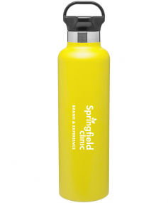 24 oz powder coated double wall 18/8 stainless steel thermal bottle with copper vacuum insulation, threaded gear-shaped insulated lid and carrying handle Complies with FDA, Prop 65. 11.25" H x 3" W