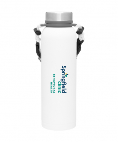 32 oz double wall 18/8 stainless steel thermal bottle with copper vacuum insulation, insulated stainless steel threaded lid, silicone ring, removable strap with buckles, removable clasps, and powder coated finish. Individual gift box. Hand wash recommended. Do not microwave. Complies with FDA, Prop 65. 11" H x 3.1875" W