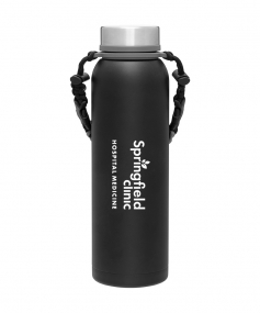 32 oz double wall 18/8 stainless steel thermal bottle with copper vacuum insulation, insulated stainless steel threaded lid, silicone ring, removable strap with buckles, removable clasps, and powder coated finish. Individual gift box. Hand wash recommended. Do not microwave. Complies with FDA, Prop 65. 11" H x 3.1875" W