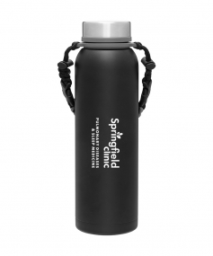 32 oz double wall 18/8 stainless steel thermal bottle with copper vacuum insulation, insulated stainless steel threaded lid, silicone ring, removable strap with buckles, removable clasps, and powder coated finish. Individual gift box. Hand wash recommended. Do not microwave. Complies with FDA, Prop 65. 11" H x 3.1875" W