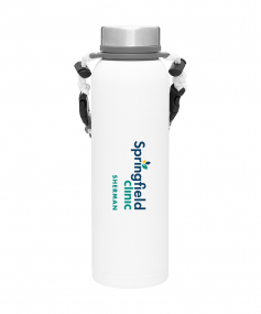 32 oz double wall 18/8 stainless steel thermal bottle with copper vacuum insulation, insulated stainless steel threaded lid, silicone ring, removable strap with buckles, removable clasps, and powder coated finish. Individual gift box. Hand wash recommended. Do not microwave. Complies with FDA, Prop 65. 11" H x 3.1875" W