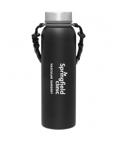 32 oz double wall 18/8 stainless steel thermal bottle with copper vacuum insulation, insulated stainless steel threaded lid, silicone ring, removable strap with buckles, removable clasps, and powder coated finish. Individual gift box. Hand wash recommended. Do not microwave. Complies with FDA, Prop 65. 11" H x 3.1875" W