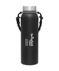 32 oz double wall 18/8 stainless steel thermal bottle with copper vacuum insulation, insulated stainless steel threaded lid, silicone ring, removable strap with buckles, removable clasps, and powder coated finish. Individual gift box. Hand wash recommended. Do not microwave. Complies with FDA, Prop 65. 11" H x 3.1875" W