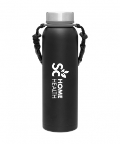 32 oz double wall 18/8 stainless steel thermal bottle with copper vacuum insulation, insulated stainless steel threaded lid, silicone ring, removable strap with buckles, removable clasps, and powder coated finish. Individual gift box. Hand wash recommended. Do not microwave. Complies with FDA, Prop 65. 11" H x 3.1875" W