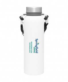 32 oz double wall 18/8 stainless steel thermal bottle with copper vacuum insulation, insulated stainless steel threaded lid, silicone ring, removable strap with buckles, removable clasps, and powder coated finish. Individual gift box. Hand wash recommended. Do not microwave. Complies with FDA, Prop 65. 11" H x 3.1875" W