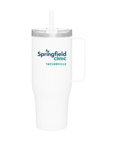 40 oz double wall 18/8 stainless steel thermal mug with copper vacuum insulation, stainless steel rim, dual-purpose push-on clear lid, matching sliding closure, flexible wide silicone straw, and powder coated finish. Individual gift box. Hand wash recommended. Do not microwave. Complies with FDA, Prop 65. 9.75" H x 4" W