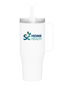 40 oz double wall 18/8 stainless steel thermal mug with copper vacuum insulation, stainless steel rim, dual-purpose push-on clear lid, matching sliding closure, flexible wide silicone straw, and powder coated finish. Individual gift box. Hand wash recommended. Do not microwave. Complies with FDA, Prop 65. 9.75" H x 4" W
