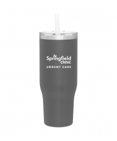 40 oz double wall 18/8 stainless steel thermal tumbler with copper vacuum insulation, stainless steel rim, dual-purpose push-on clear lid, matching sliding closure, flexible wide silicone straw, and powder coated finish