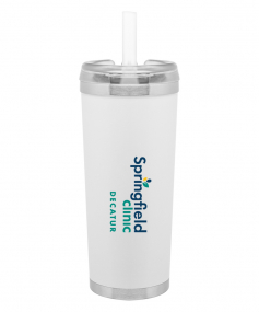 24 oz double wall 18/8 stainless steel thermal tumbler with copper vacuum insulation, stainless steel rim and base, threaded Eastman Tritan lid, snap closure, straw opening, and flexible wide silicone straw.