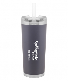 24 oz double wall 18/8 stainless steel thermal tumbler with copper vacuum insulation, stainless steel rim and base, threaded Eastman Tritan lid, snap closure, straw opening, and flexible wide silicone straw.