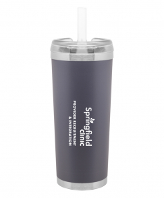24 oz double wall 18/8 stainless steel thermal tumbler with copper vacuum insulation, stainless steel rim and base, threaded Eastman Tritan lid, snap closure, straw opening, and flexible wide silicone straw.