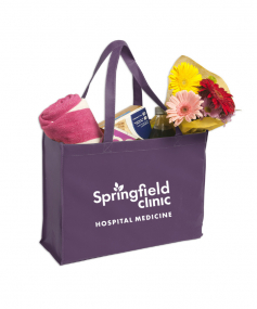 Constructed of 80 gsm non-woven polypropylene with reinforced 22" handles and 6" gusset. Complies with Prop 65. 12" H x 16" W x 6" D