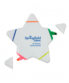 5 highlighter's in 1. Plastic case includes 5 bright neon colors, one at each point: green, blue, orange, yellow and pink. Complies with CPSIA, Prop 65. 4.5" W x 4.5" H x 0.33" D